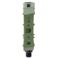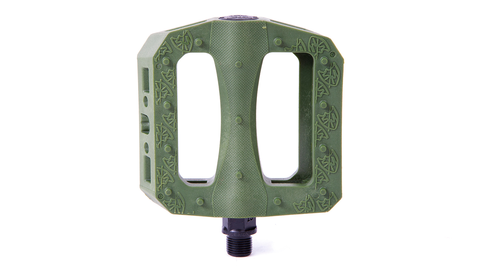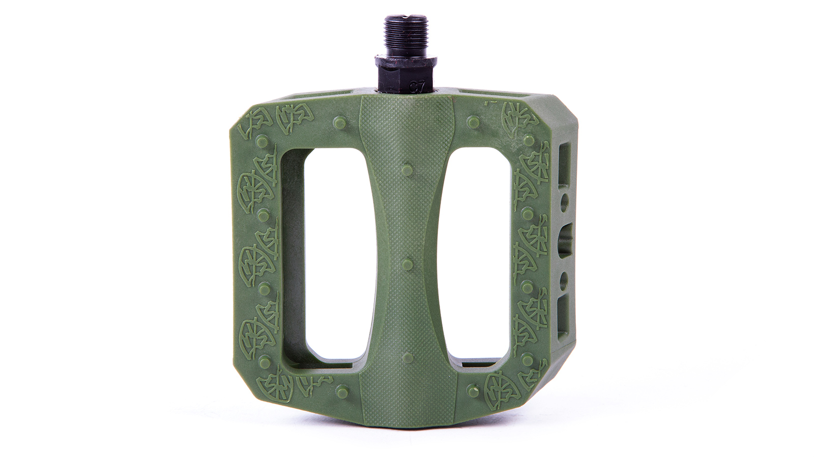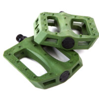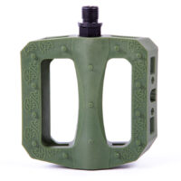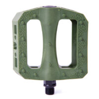 Oversized CrMo spindle for strength. Large body. Thin design. Accepts 6mm Allen, 15mm and 17mm wrench for installation/removal. Wider surface also allows use of adjustable wrench. The larger, ergonomic shape is designed for grip and support. Micro-knurled surface and molded pins for traction. Long lasting nylon/fiber blend for sliding.
