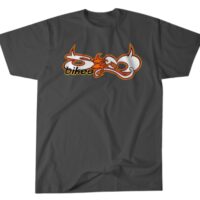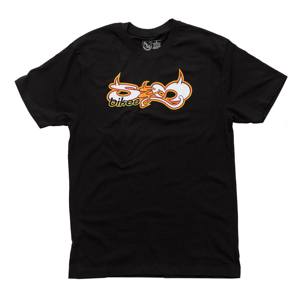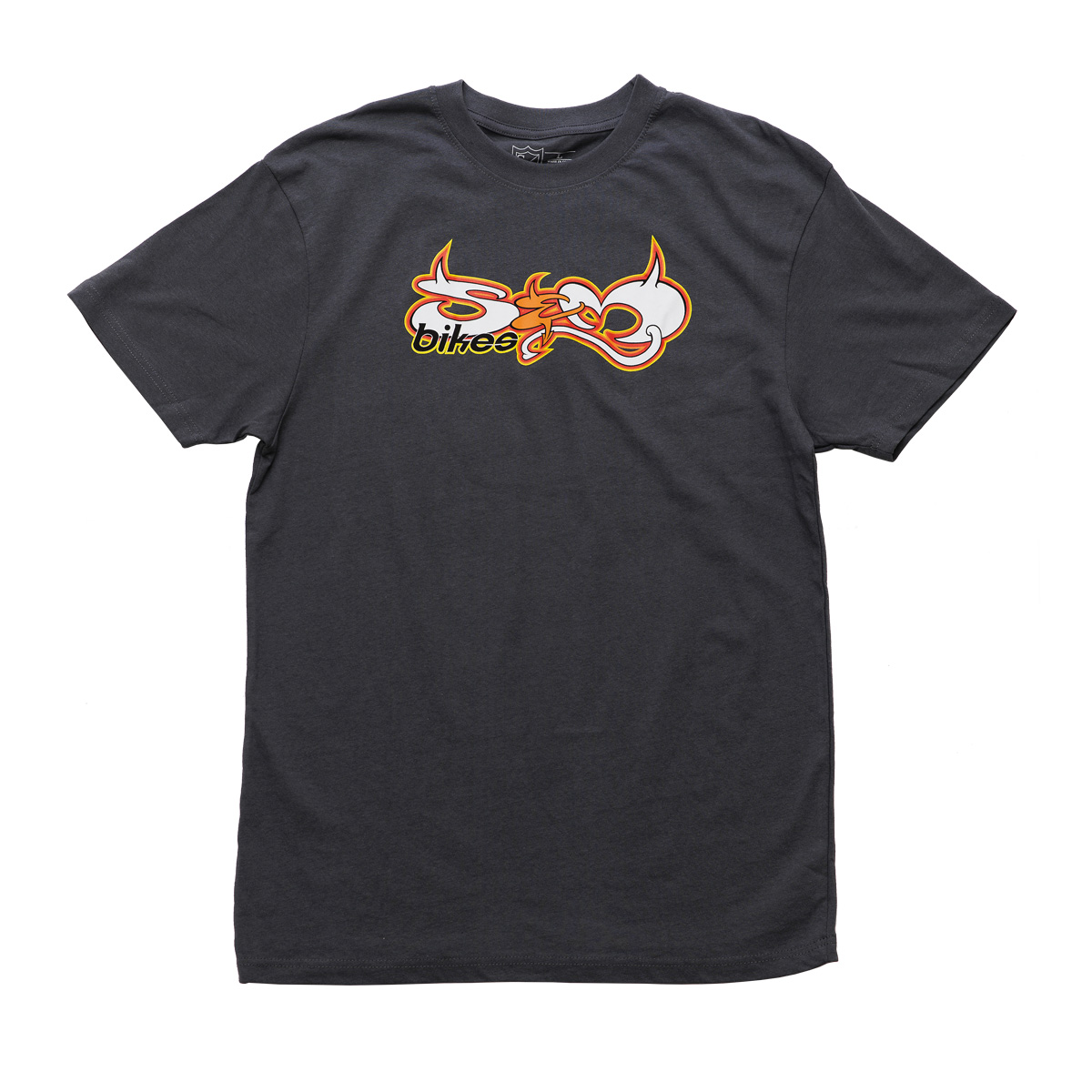 Can’t stop the re-pop! Aryei Levenson is a new school S&M rider with some mid school style. From his frame design to his riding style, he’s always drawing from the past to help shape the future. His choice in mid-school S&M Tee’s is a heavy weight seamless sided old-school style blank with a 90’s re-pop design. In this case it’s the Devil Letters design from (insert date here).